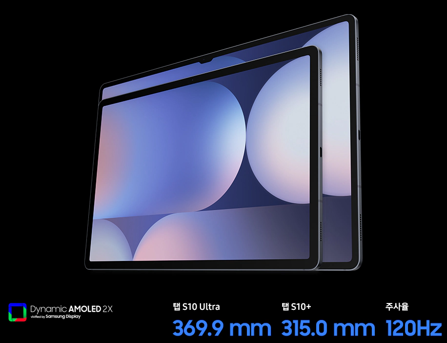 아머 알루미늄으로 제작된 갤럭시 탭 S10 시리즈는 내구성이 높은 디자인과 함께 IP68 등급의 방수 및 방진 기능을 갖추고 있습니다. S10 울트라는 최대 14.6인치 화면, 플러스 모델은 12.4인치 다이나믹 AMOLED 2X 디스플레이를 탑재하였으며, 120Hz 주사율로 부드러운 시각 경험을 제공합니다.