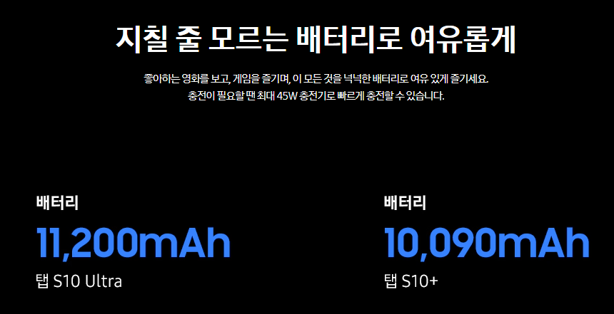 S10 울트라는 11,200mAh, S10 플러스는 10,090mAh 배터리를 탑재하여 오래 지속되는 사용이 가능하며 45W 유선 충전을 지원합니다. 이번 시리즈에서는 미디어텍의 최신 디멘시티 9300+ 칩셋이 적용되어, 기존 대비 CPU, GPU, NPU 성능이 대폭 향상되었습니다.