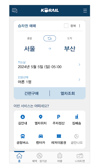 (2) 앱을 실행하고 승차권 예매 부분에서 출발과 도착에 지역을 입력하고 가는날, 인원수를 입력한 다음 열차 조회를 눌러줍니다. 코레일톡앱은 기차 예매뿐만 아니라 길안내, 주차정산, 짐배송, 렌터카 등 다양한 서비스를 한 번에 이용할 수 있어요.