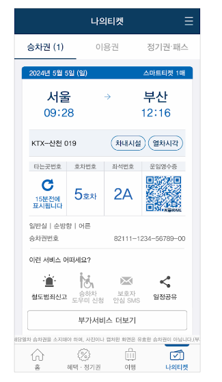 (5) 하단 버튼 중 나의 티켓에서 내가 예매한 티켓 정보를 확인 가능하며 앱으로 결제시 스마트티켓으로 발권이 따로 필요 없습니다. 보안상 화면 캡처는 안되기 때문에 핸드폰 충전 잘하여 앱 이용을 할 수 있게 준비해놔야겠네요.