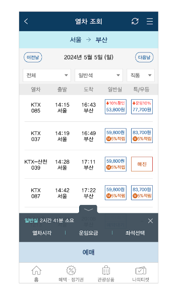 (1) 당일 새벽이나 아침에 생기는 취소표를 노립니다. 원하는 시간대 기차표가 매진이 되었다면 어플을 깔고 시시때때로 들어가서 취소표가 생겨서 예매가 가능한지 확인 합니다.
