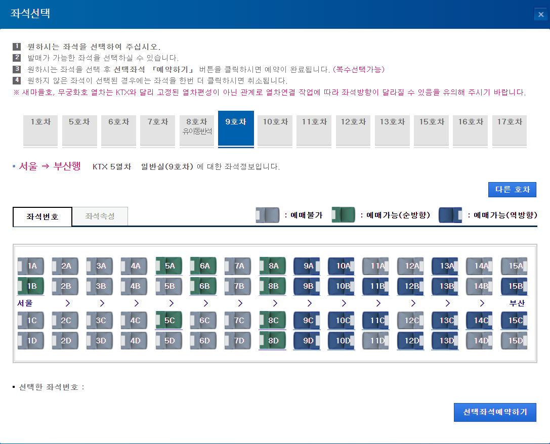 (2) 보통 출발 한달전부터 출발 20분 전까지 예매 가능하니 명절 같은 특수한 휴일을 위해서는 오픈하는 날짜를 알아두고 티켓팅을 합니다. 특수 휴일 티켓팅은 좌석 선택 할 시간도 없이 바로 예매 버튼을 눌러도 겨우 될까 말까 합니다.