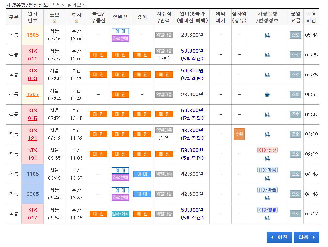 (2) 그러면 아래와 같이 예매 가능한 기차들이 해당 시간대 이후로 쭉 나열되며 가격도 확인 가능합니. 예매 가능한 것은 예매 버튼이 활성화되어 있어서 예매 버튼을 누르면 예매가 가능하고 결제하면 됩니다.