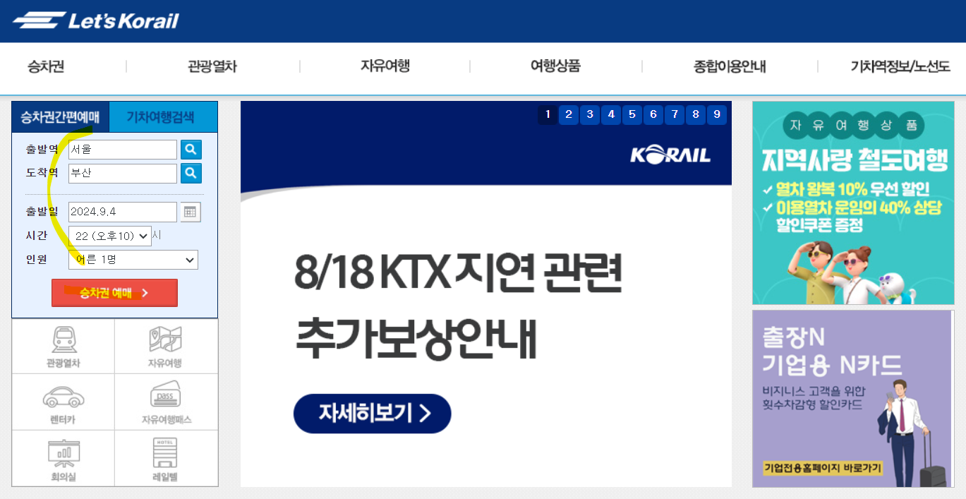 (1) 레츠코레일 홈페이지로 들어가서 가입과 로그인을 한 후 왼쪽에 승차권 간편 예매에서 출발역, 도착역, 출발일, 시간, 인원을 입력하고 승차권 예매 버튼을 누릅니다.